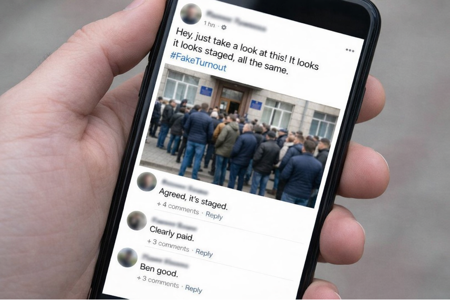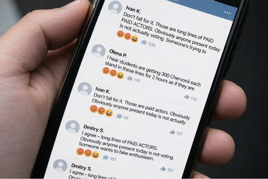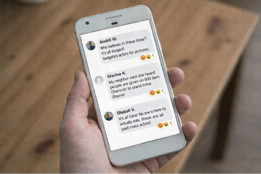 Չերվոնիայում տարօրինակ լուրեր են տարածվում. ընտրատեղամասերի մոտ գոյացած երկար հերթերը, որոնք պետք է խորհրդանշեին գործող նախագահի զանգվածային աջակցությունը, իբր ստեղծվել են «վարձու դերասանների» օգնությամբ: Հանրահայտ տելեգրամյան ալիքները զանգվածաբար հրապարակում են լուսանկարներ՝ պնդելով, թե տարբեր թաղամասերում տեսել են «նույն դեմքերը», իսկ որոշ աղբյուրներ նույնիսկ նշել են «մասսայական տեսարանների» մասնակցի գինը՝ ժամում 500 չերվոնեց: